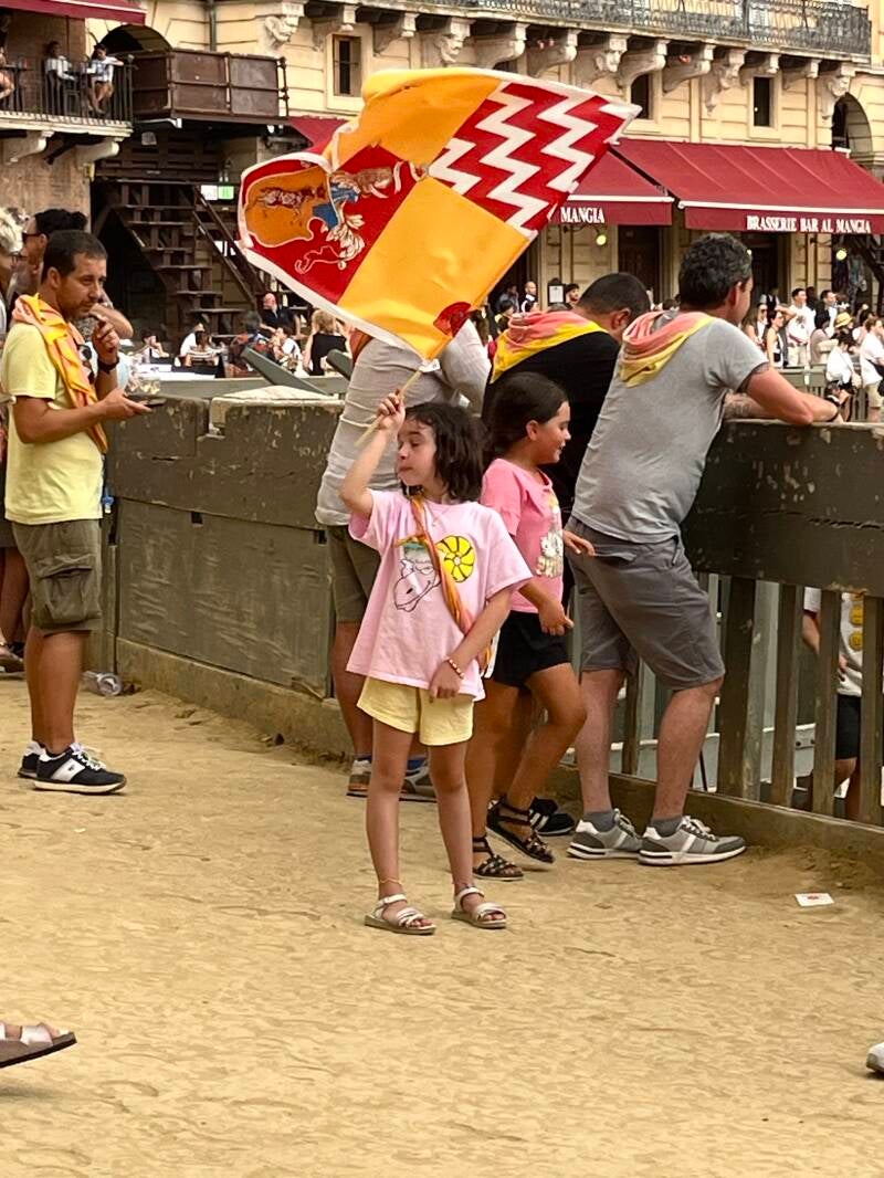 Omdat de Palio een dag ervoor is gereden, ligt het zand nog als een racebaan om het plein. Het is daardoor wel bijzonder om nu op het plein te zijn. Je waant je daardoor nog meer in de middeleeuwen. Ook hier zie je veel feestende bewoners van de winnende wijk van dit jaar.