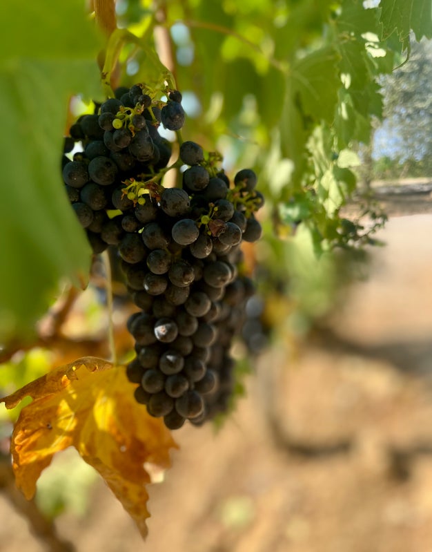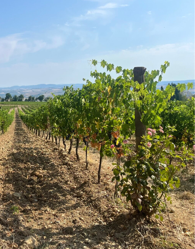 Bij aankomst worden we welkom geheten door een jonge vrouwelijke medewerkster en beginnen we met een rondleiding door de wijngaard. Ik zie rozen voor elke rij druiven staan, en vraag me af waarom dat is. Het blijkt dat als er ziektes zijn, dat dat meteen aan de rozen te zien is. Vandaar dat elke druivenrij begint met een vrolijke kleur rozen.