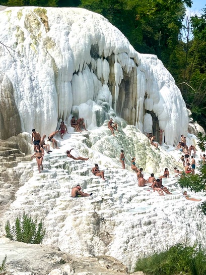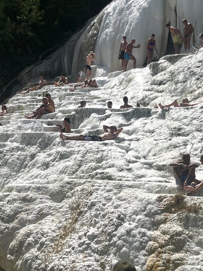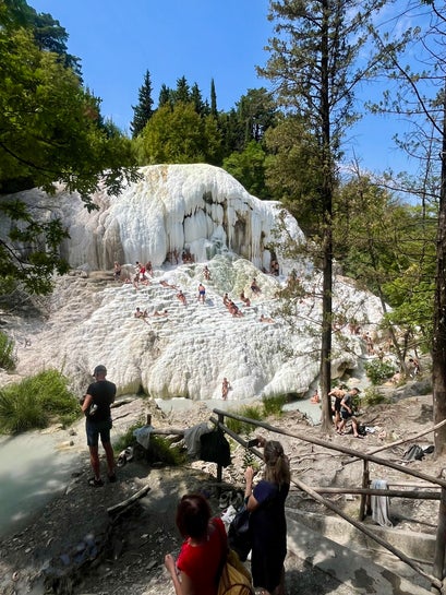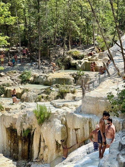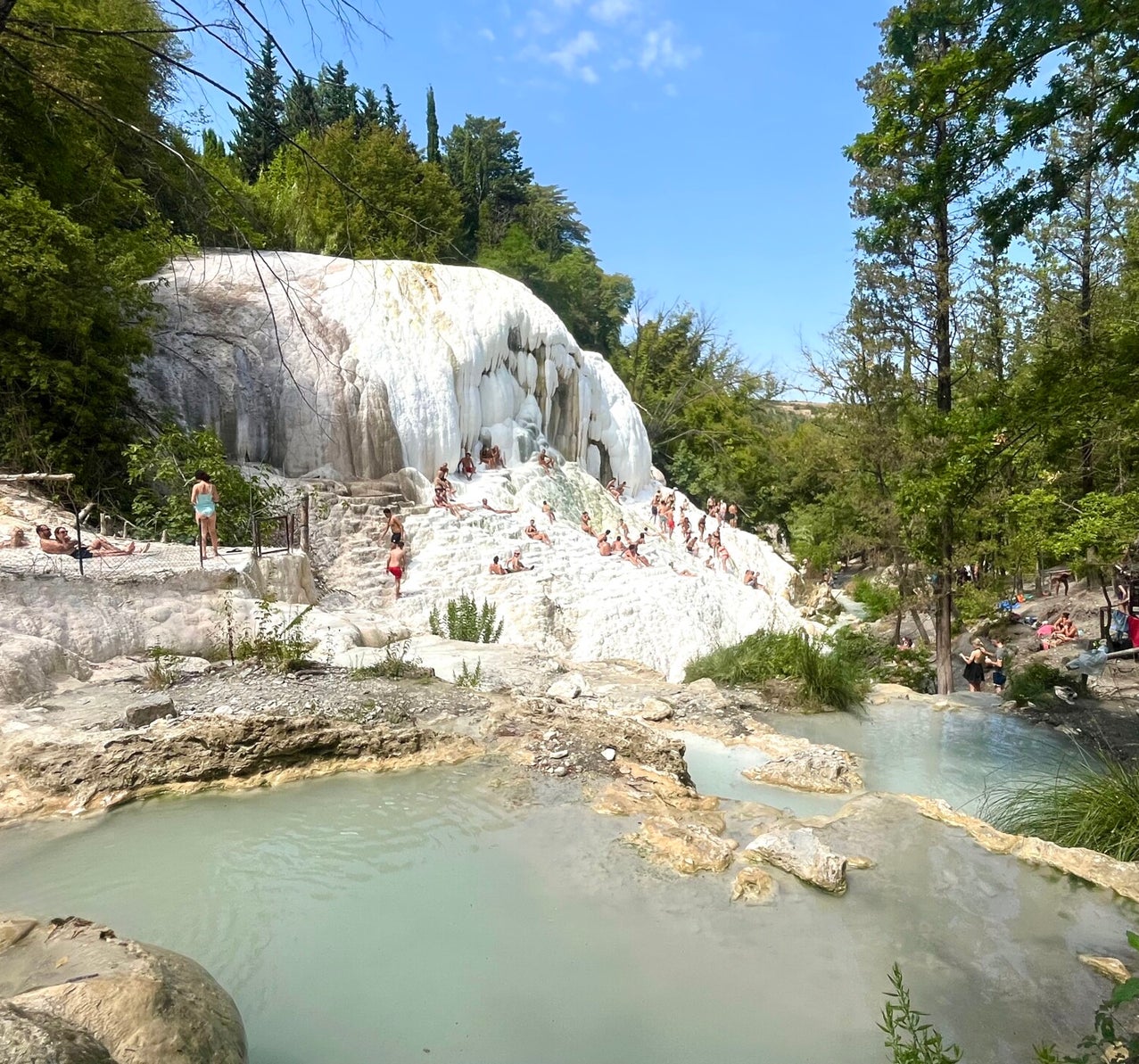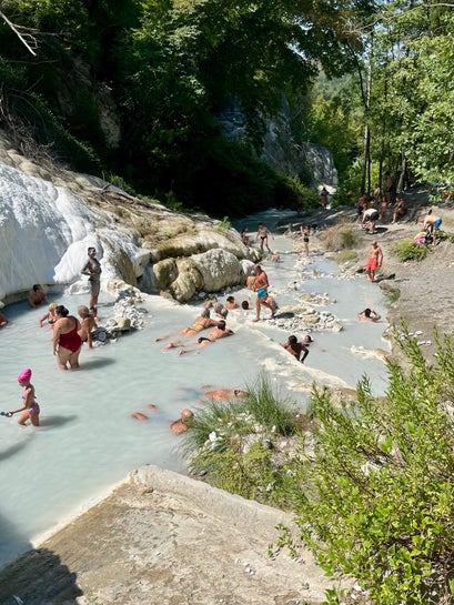 Bij aankomst in het kleine dorpje Bagno San Filippo is het druk. De warmwaterbronnen zijn populair onder de Italianen en toeristen.