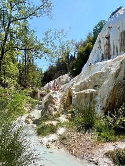 Verborgen tussen de bossen van de Monte Amiata ligt Bagni San Filippo – een klein thermenplaatsje waar de natuur écht de hoofdrol speelt. Hier borrelt heet, mineraalrijk water rechtstreeks uit de grond en stroomt het over witte kalksteenformaties. Het bekendste plekje is de Balena Bianca, een gigantische witte rots die lijkt op een bevroren waterval. Tussen de poeltjes kun je zomaar neerploffen en genieten van een gratis wellness onder de Toscaanse lucht. Om bij de bronnen te komen, volg je het bordje Fasso Bianco. De ingang ligt aan de Via Fasso Bianco tegenover een klein restaurant: Mimmo e Barbara. Daarna wandel je over een bospad naar de bronnen. Echt bizar mooi.