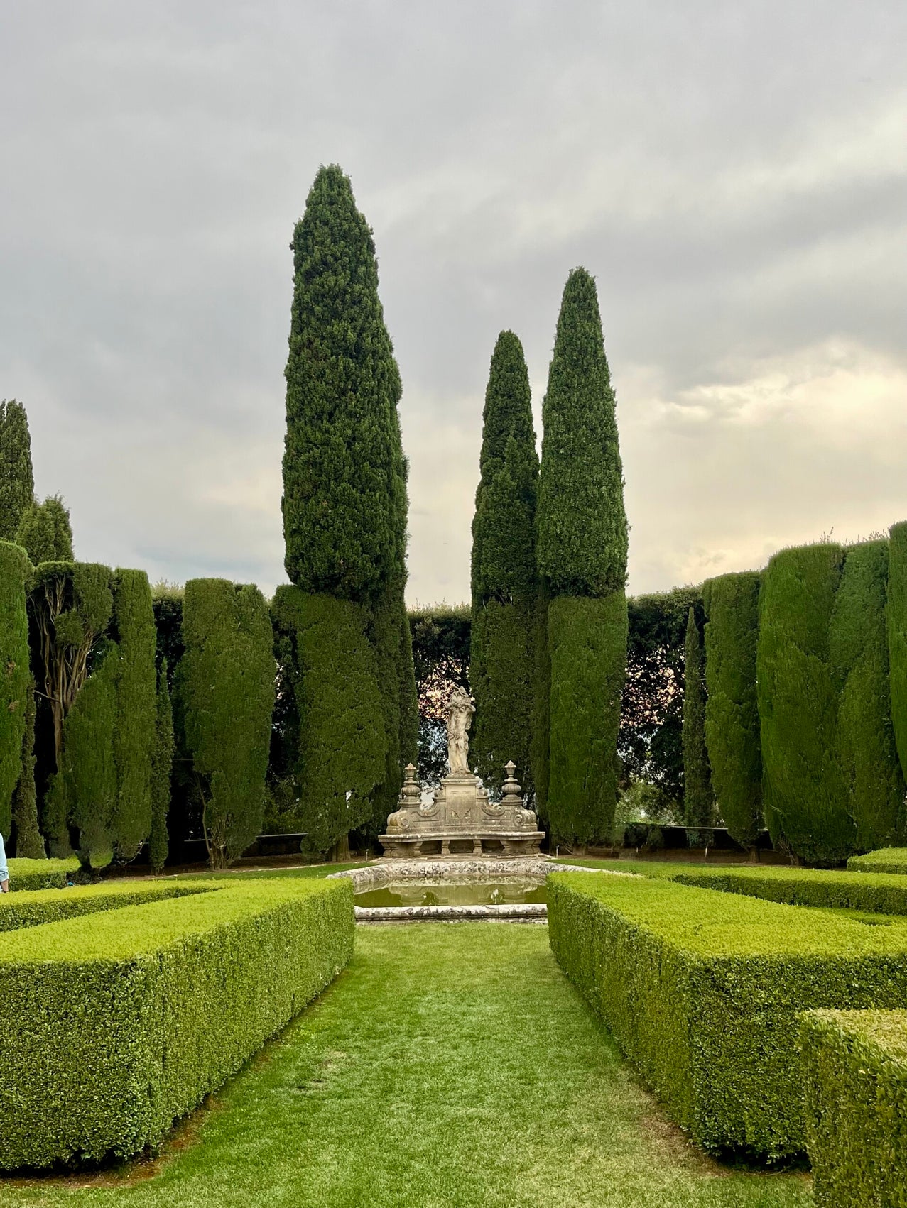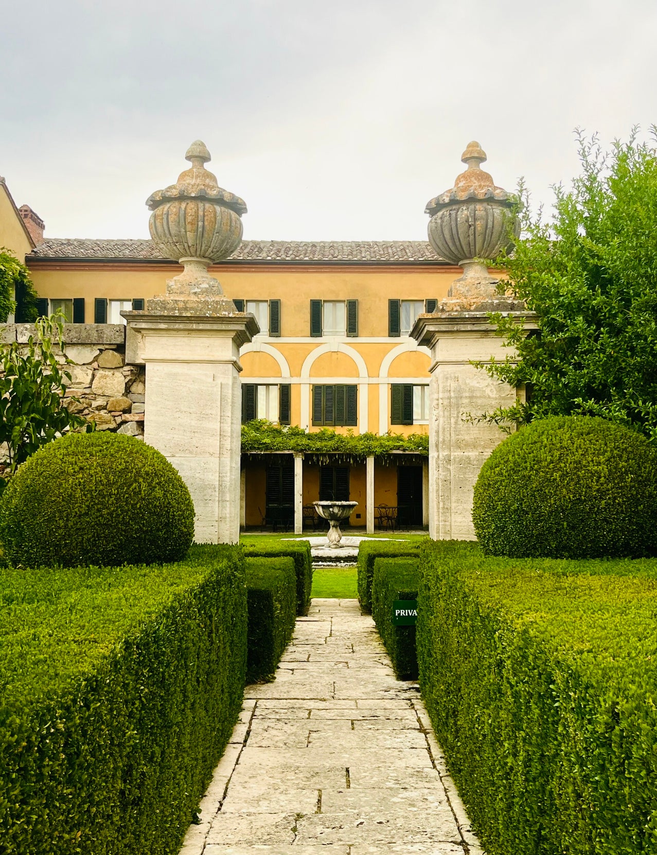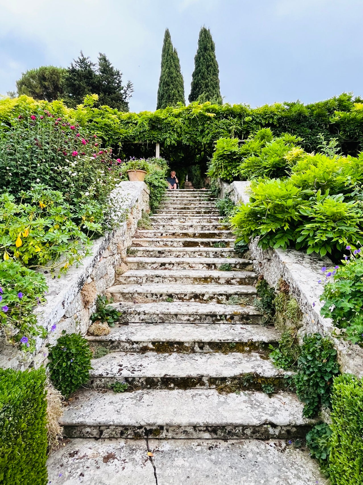 Wij hebben tickets voor de woensdag om 18:00 uur en we redden het maar net. De tuinen worden vanuit Spedaletto beroerd aangegeven. We rijden er in eerste instantie helemaal voorbij. Wanneer we omkeren, zien we wel bordjes staan. Een beetje vroeger vertrekken is daarom wel handig. Arjan parkeert onze bolide en ik spurt naar binnen, waar de groep op punt van vertrekken staat. Arjan trekt ook nog even een sprintje, en dan gaan we op weg. Tijdens de wandeling door de tuien, vertelt de gids onderuit over het ontstaan en de bewoners van de villa en de daarbij behorende tuinen.