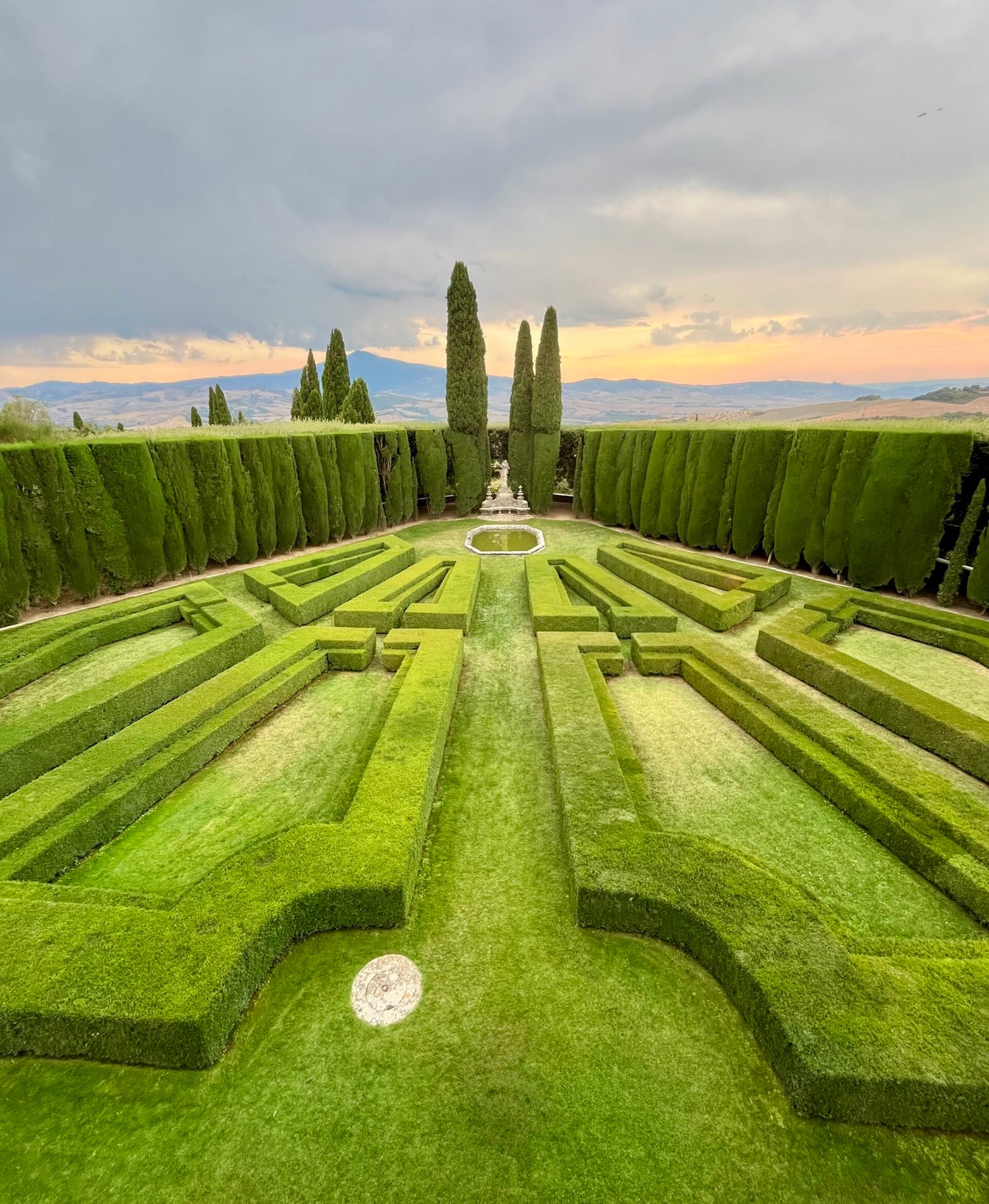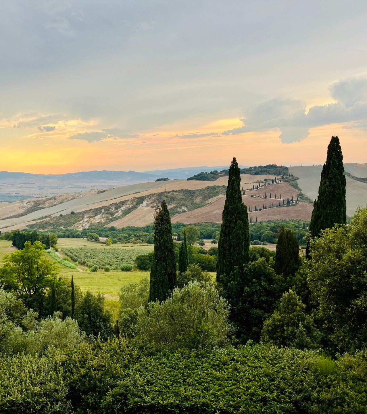 We dwalen langs mooie strakke lanen, en hebben af en toe uitzicht over de prachtige Val d'Orcia. Je ziet zelfs de beroemde Zig Zag weggetjes liggen. Een van de vele kenmerken van de streek. Ik moet eerlijk zeggen, dat om 18:00 uur een perfecte tijd is om de tuin te bezoeken in augustus. De zon zakt al een beetje, en daardoor krijg je prachtige luchten boven de Val d'Orcia.