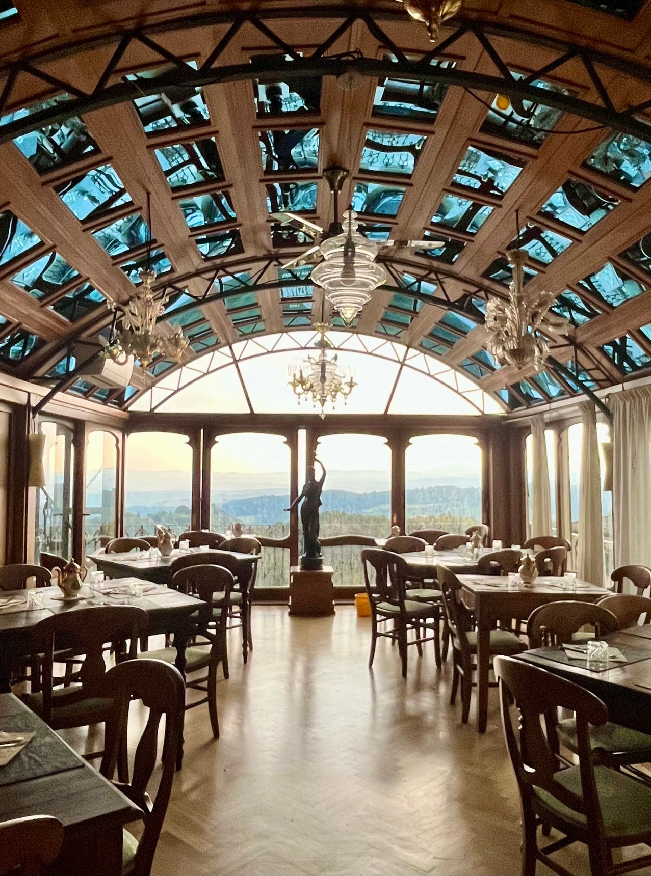 Het blijkt dat er boven een lunchroom is, dus we nemen de trappen naar boven. Daar vallen we in een nog grotere verbazing. De inrichting en het uitzicht zijn een plaatje. En...er is een tafeltje vrij voor ons.