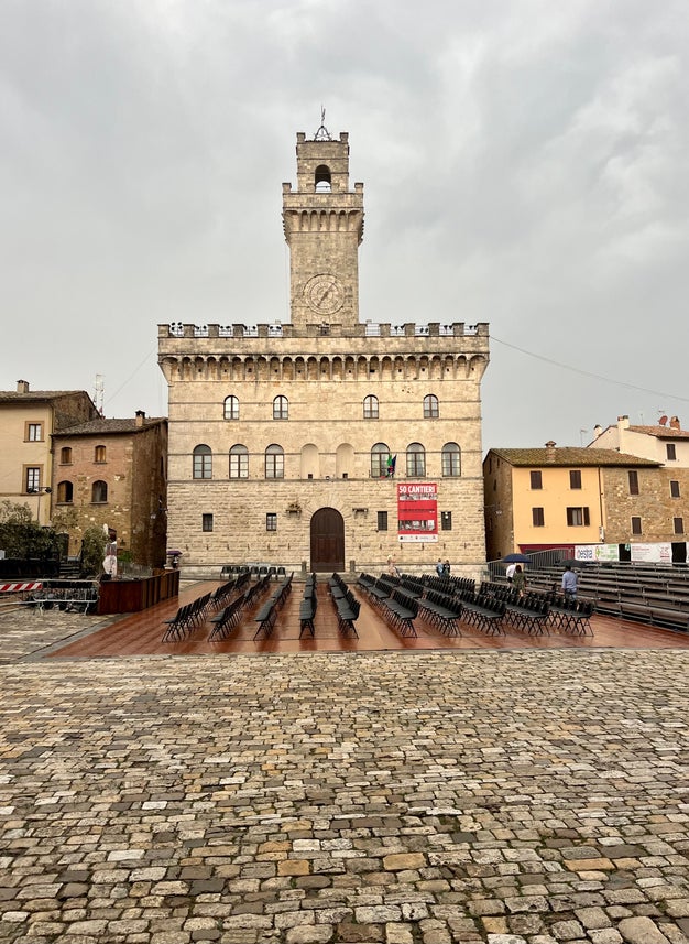 We gaan eerst maar eens aan een late lunch beginnen, misschien klaart het later nog op. De prachtige uitzichten over de vallei blijven spectaculair, ondanks het mindere weer. Montepulciano is ligt op een heuvel, dus je kuitspieren worden flink aan het werk gezet!