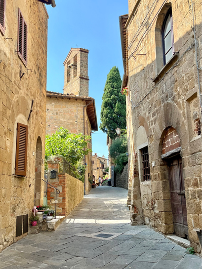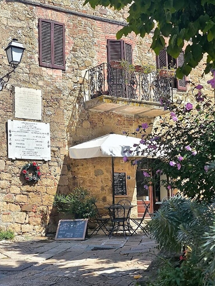 Wat Monticchiello extra bijzonder maakt, is de intieme sfeer: er is geen massatoerisme, waardoor je er rustig kunt ronddwalen en een espresso drinken op het terras. Wij lunchen bij Angolo di Mezzo. Een klein maar fijne restaurantje, waar we een plekje in de schaduw kregen. Een super gezellige medewerkster brengt je de broodjes en koffie.