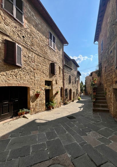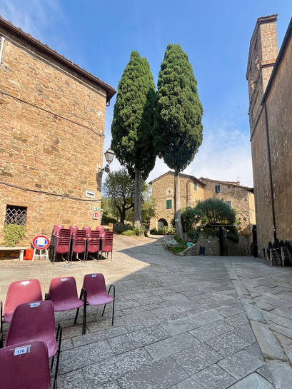 Monticchiello is klein, maar voelt groots in charme en is bekent om zijn “Teatro Povero”, een uniek dorpsinitiatief waarbij inwoners elk jaar zelf toneelstukken schrijven en opvoeren over tradities en dorpsleven. De stoeltjes staan al klaar als we door het de straatjes slenteren.
