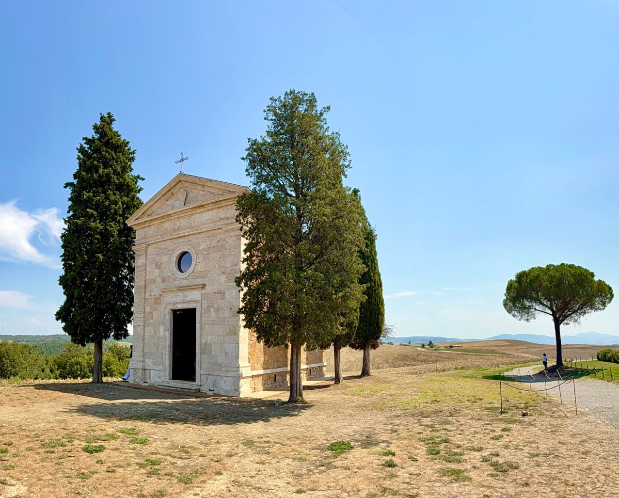 De Capella della Madonna di Vitaleta is met haar cipressen en de oude podere een van de mooiste plekken van Italië en waarschijnlijk ook een van de meest gefotografeerde plaatsen in Toscane. Let wel goed op het bordje aan de SP146. Het kerkje wordt niet zo heel duidelijk aangegeven.