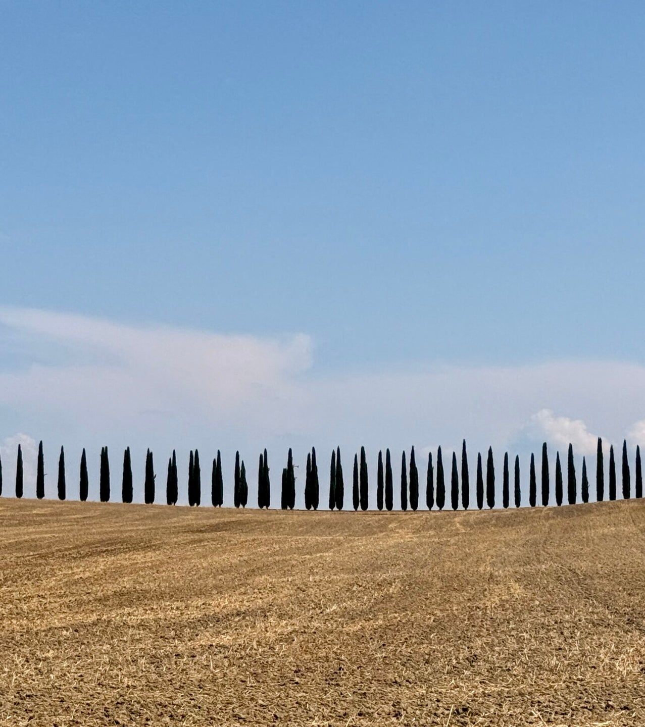 Er zijn eigenlijk twee kleine bosjes cipressen: eentje direct langs de hoofdweg, compact en strak , en een tweede groepje dat zich iets verderop rond een kronkelend weggetje verspreidt.