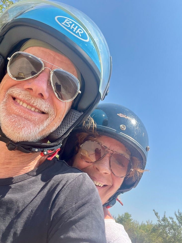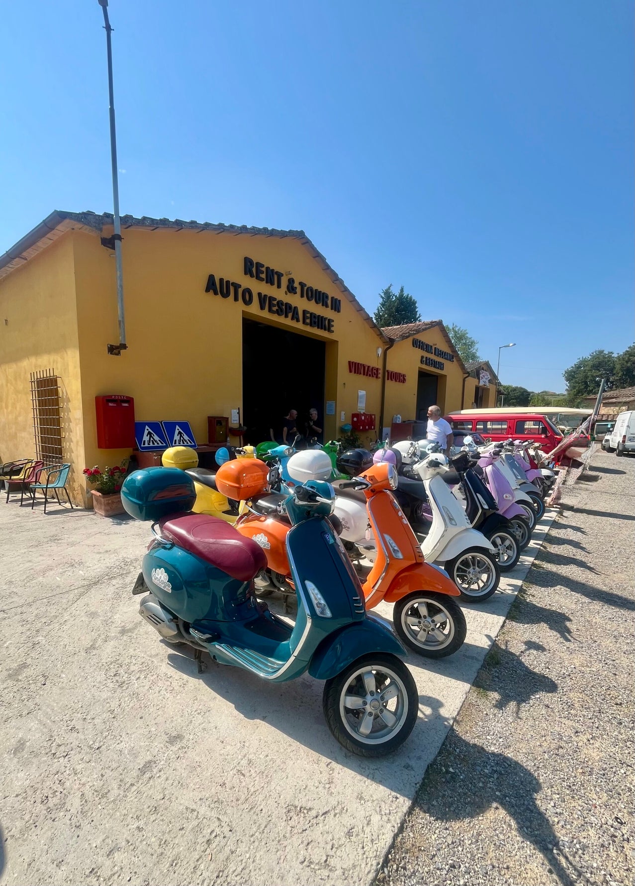 We halen 's morgens eerst onze Vespa op bij Vintage Tours Toscana in Pienza. We krijgen een leuke gele Vespa mee, en zijn helemaal happy en klaar voor een dag touren. Helmpje op en gaan. Je krijgt van de medewerkers een goede uitleg over de routes, hoe de Vespa werkt, en hoeveel tijd je hebt. Men verhuurt er ook gewone scooters en Old Timer auto's zoals een Fiatje 500. Echt megaleuk om te zien.