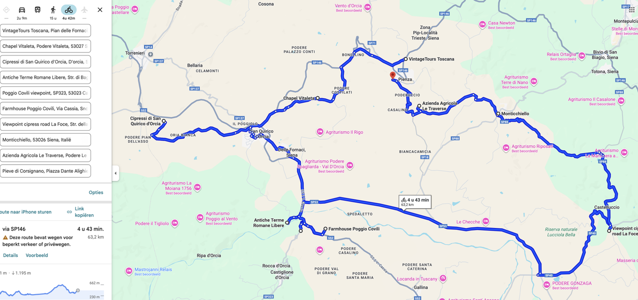 Je kunt deze route met een auto, fiets of scooter maken en starten waar je wilt. Er is geen begin of eindpunt. Wij zijn gestart in Pienza bij het verhuurbedrijf Vintage Tours Toscana omdat ik Arjan een Oldtimer Vespa Tour cadeau had gedaan voor z'n verjaardag. Ook met een beetje eigenbelang, want ik het leek mij een geweldig avontuur.