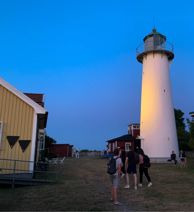 We worden heel vriendelijk ontvangen, en krijgen 2 gezellige kamers. Stapelbedden voor onze pubers en een 2 persoonkamer voor ons. Bij de vuurtoren heerst een bijzondere rust, waar je heerlijk kunt ontspannen in de grote tuin, die uitkijkt over de zee en gewoon kunt genieten van de sfeer. Het typische Zweedse rood viert de boventoon. We kunnen gelukkig nog iets kleins te eten bestellen. Daarna verkennen we de tuin en vuurtoren bij nacht.